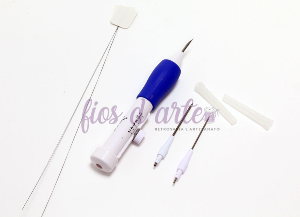 O kit inclui uma agulha mágica para bordar, dois enfiadores e três agulhas de diâmetros diferentes: 1,3mm, 1,6mm e 2,2mm.