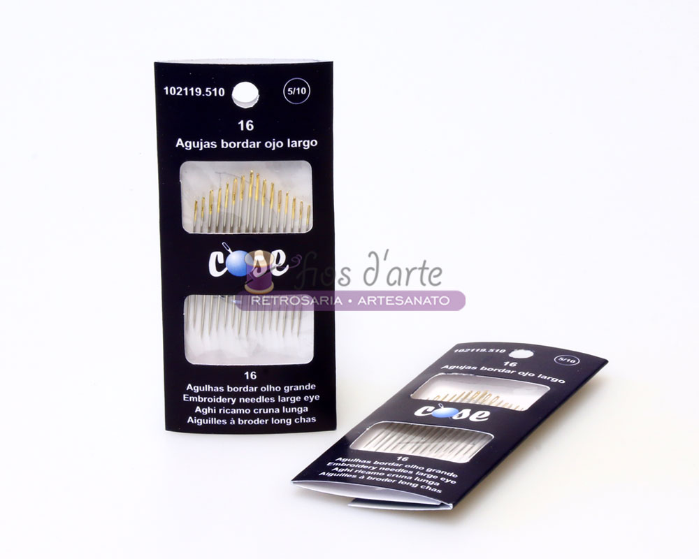 Agulhas de bordar/costurar olho largo, ponta fina Embalagem com 16 agulhas Tamanho: 5-10
