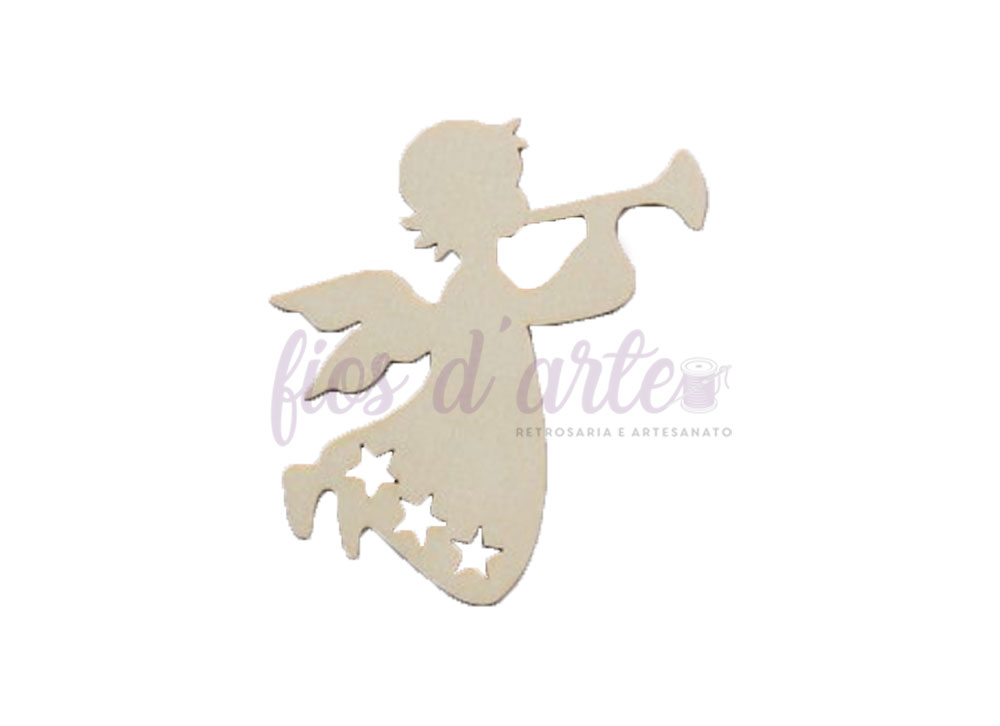 Anjo com corneta e estrelas em choupo (8x10x0,3cms)
