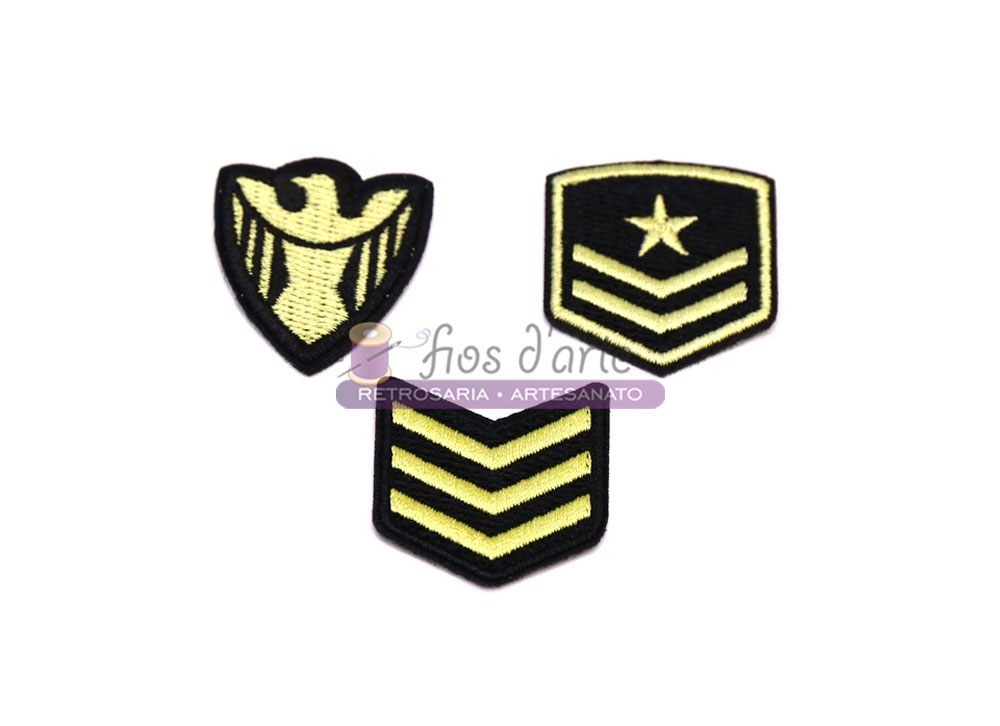 Aplicações termocolantes Motivos Militares bordadas Conjunto composto por: 3 símbolos de motivos militares Tamanho: 2,8cms (+/- largura dos 3 símbolos)