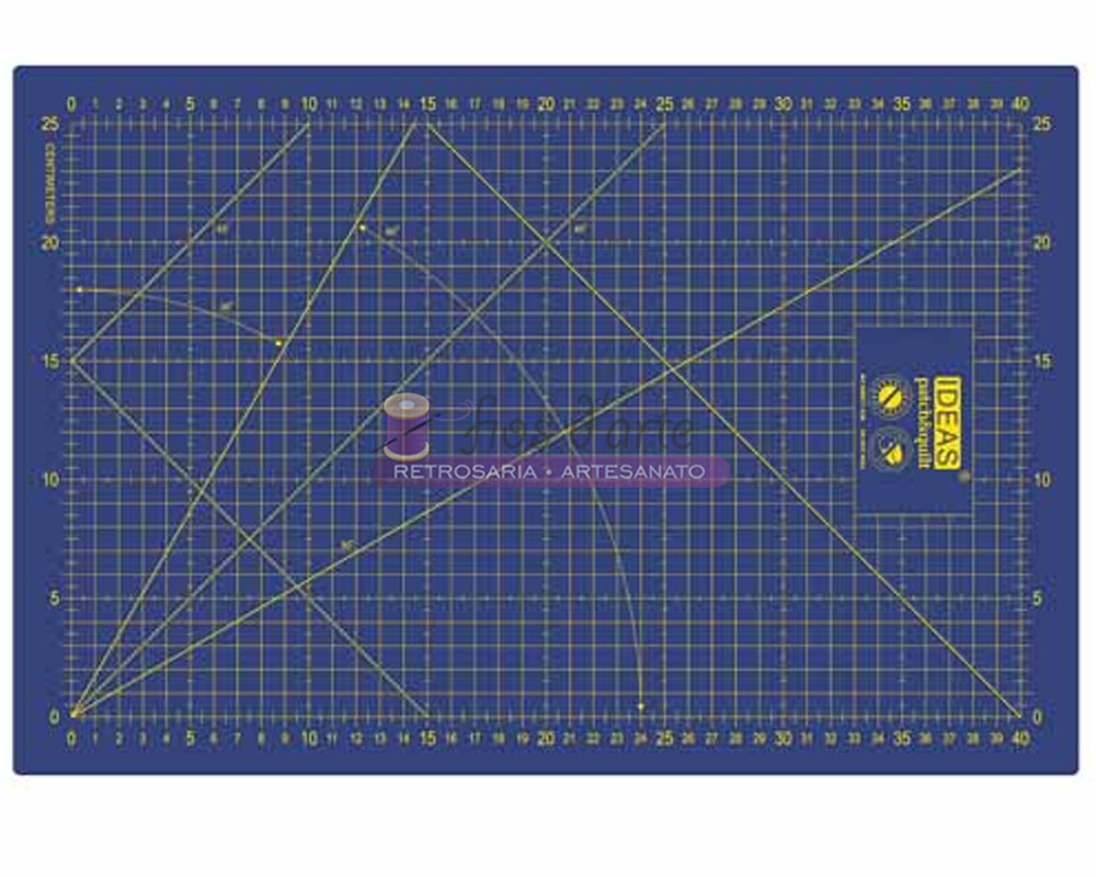 - A base de corte tem marcações de centímetros e de polegadas de ambos os lados.