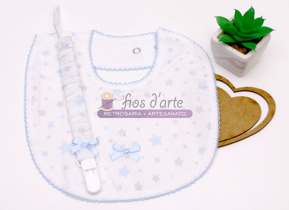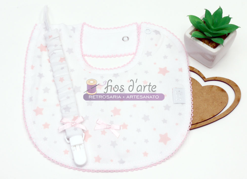Conjunto Babete e prende-chupeta estrelinhas e lacinho