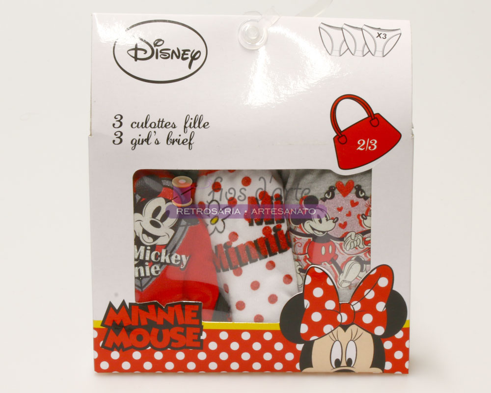 Conjunto de três cuecas para menina Composição: 100% algodão Tamanho: 2/3 anos Tema: Minnie