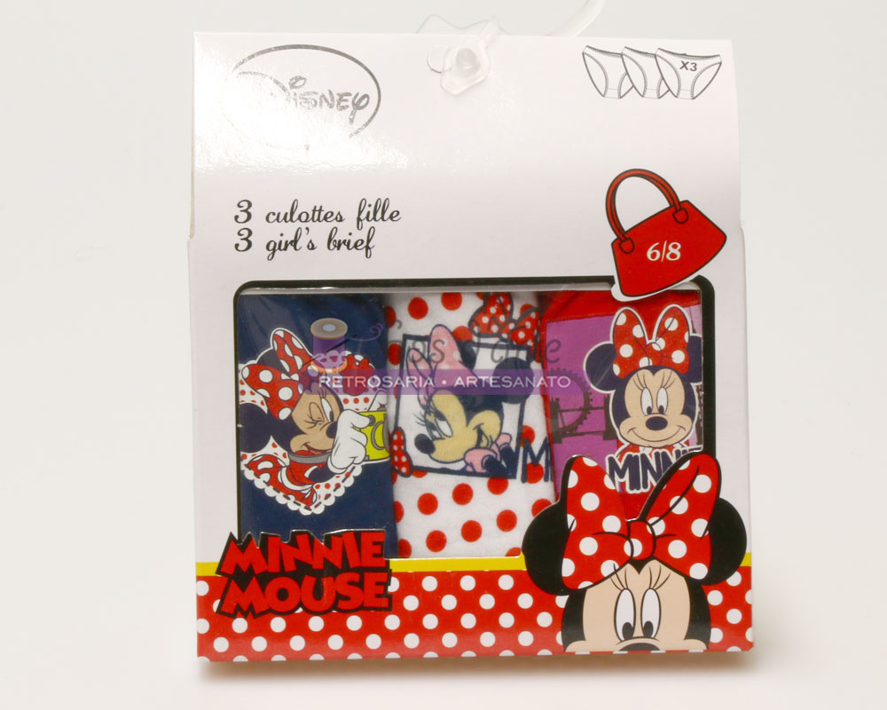 Conjunto de três cuecas para menina Composição: 100% algodão Tamanho: 6-8 anos Tema : Minnie