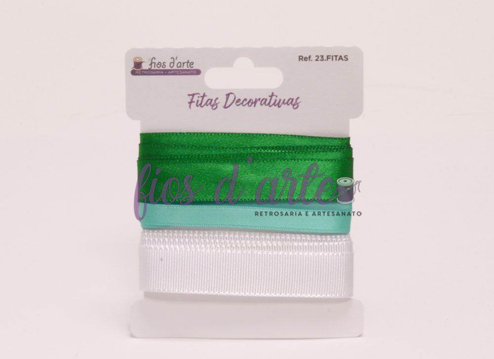 Conjunto de 3 fitas Composto por: - 1 mt gorgurão branco 15mm - 1 mt fita cetim verde água 8mm - 1 mt fita cetim verde 16mm