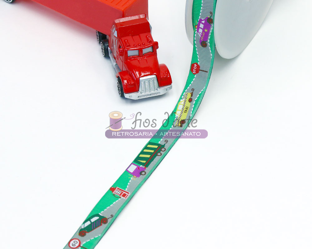 Fita decorativa verde com padrão de estrada e carrinhos coloridos perto de carrinho de brinquedo vermelho