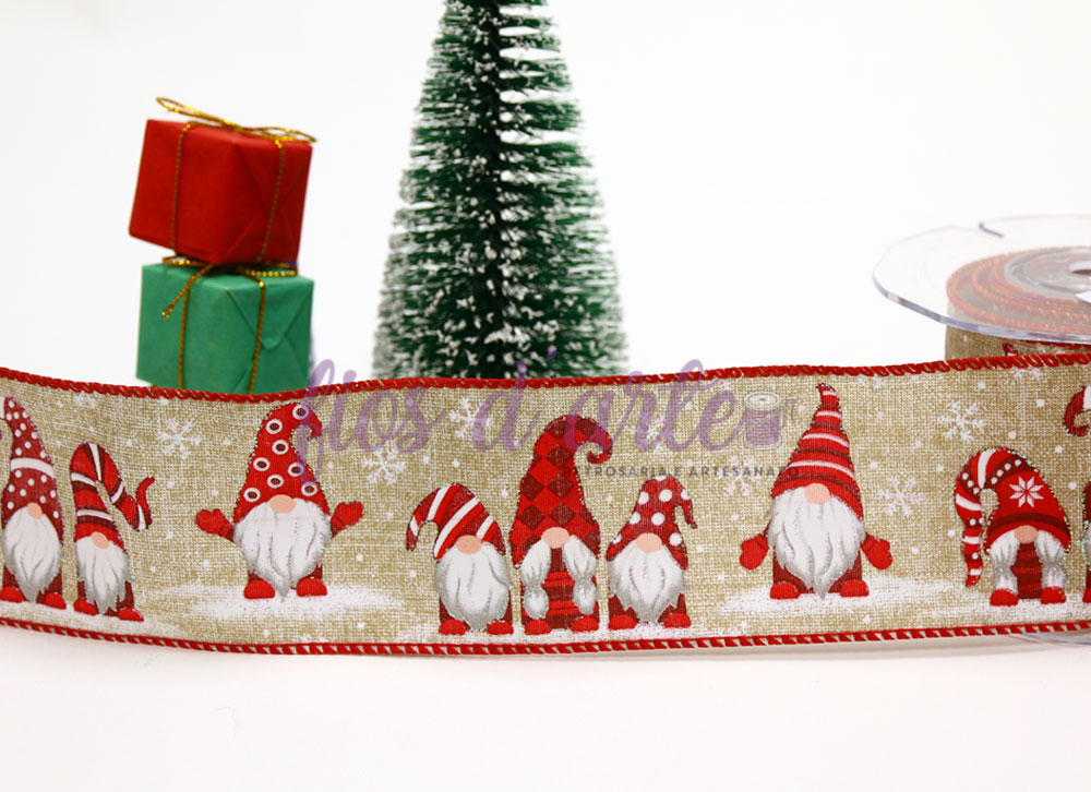 Fita juta aramada Gnomo com neve Composição: 100% poliester Largura: 63mm