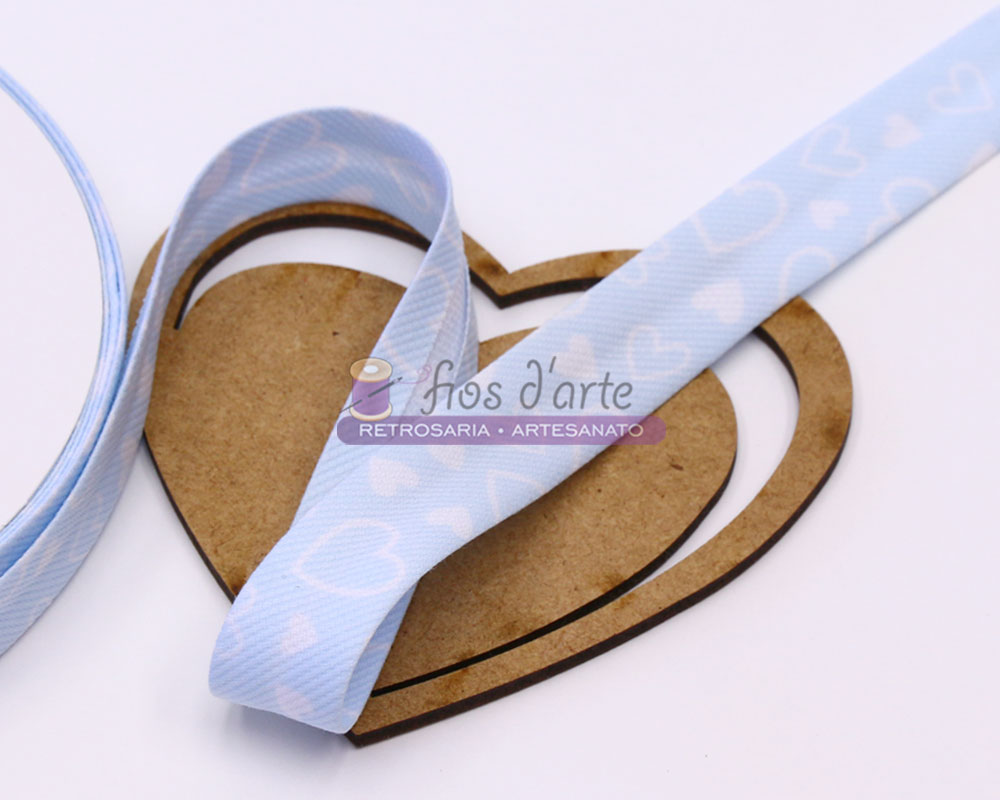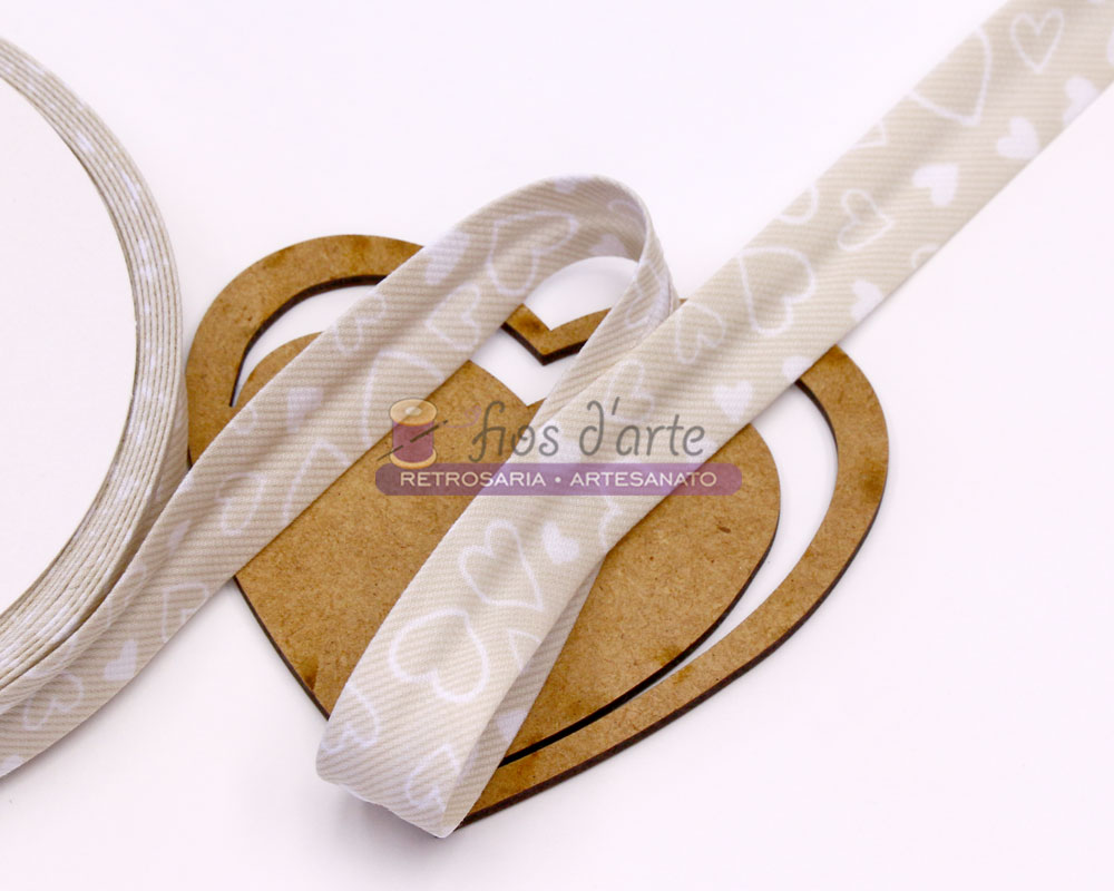 Fita viés estampada corações Composição: 45% Poliester e 55% Algodão Largura: 18mm Cores disponíveis: azul bebé, bege e cinzento