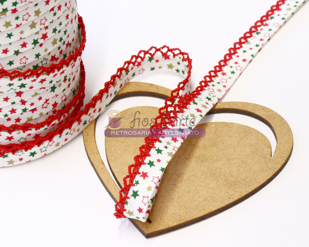 Com estrelinhas em vermelho e verde e fundo vermelho, esta fita de viés é excelente para trabalhos natalícios.