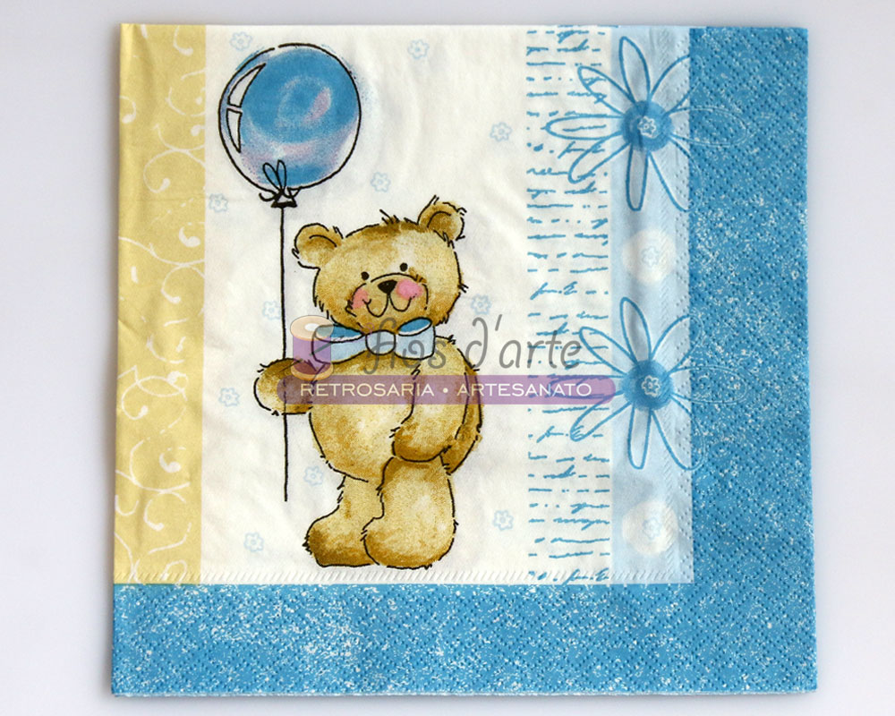Guardanapo G36.013.1 A imagem representa uma das faces do guardanapo e tem um urso na cor azul. Tamanho: 33x33