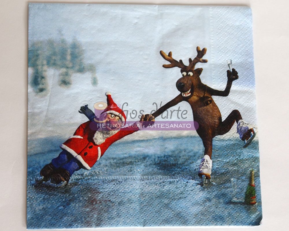 Guardanapo G36.027 A imagem representa uma das faces do guardanapo e tem uma rena e o Pai Natal Tamanho: 33x33