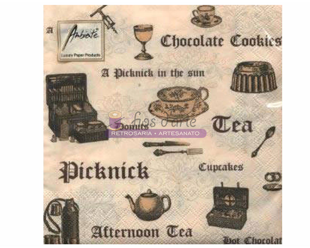 Guardanapo G36.032 A imagem representa umas das faces do guardanapo e tem como tema o chá. Tamanho: 33x33