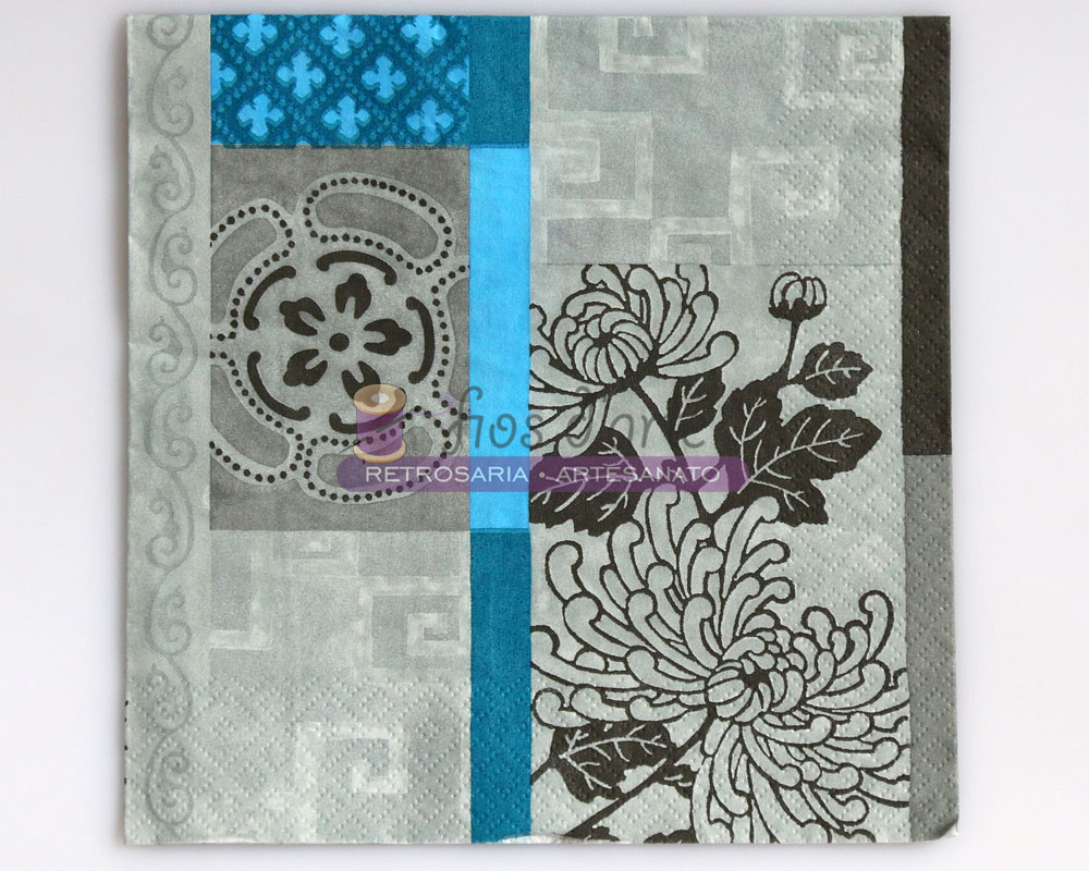 Guardanapo G36.047 Tamanho: 33x33 A imagem representa uma das face do guardanapo com tons azuis e cinzentos
