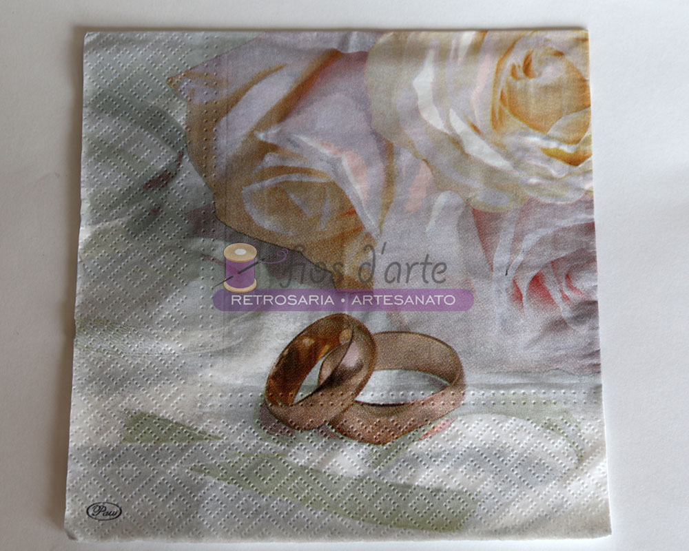 Guardanapo G36.053 A imagem representa uma das face do guardanapo e tem alianças de casamento em destaque Tamanho: 33x33