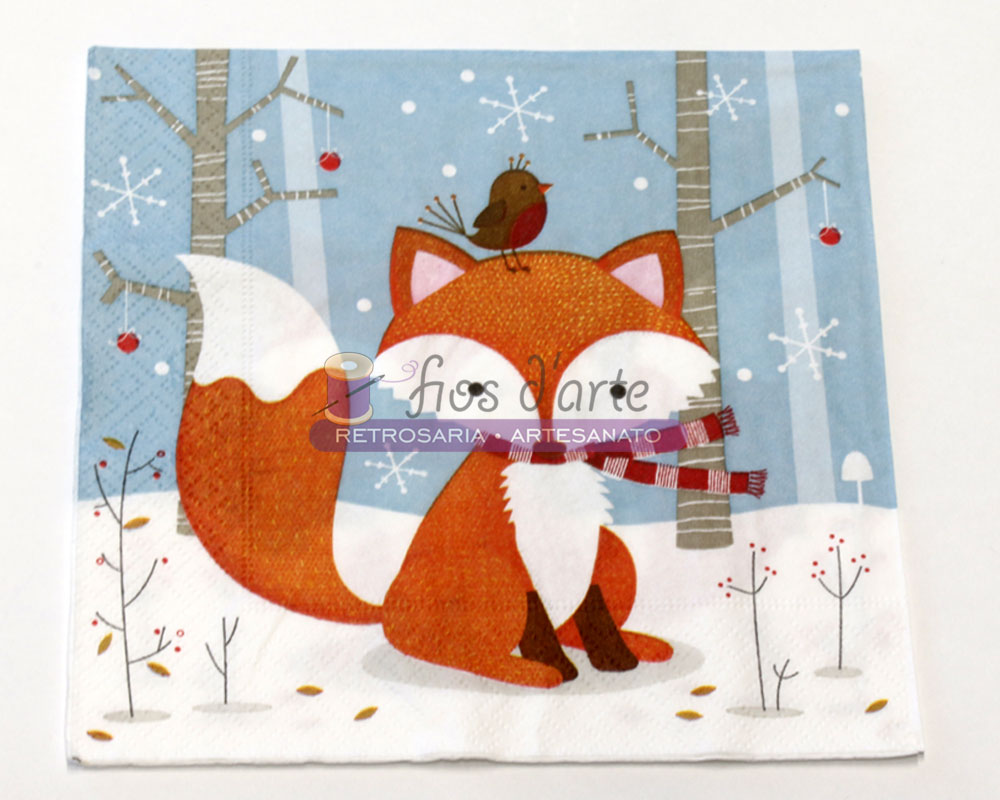 Guardanapo G36.066 Tamanho: 33x33cm A imagem representa uma das faces do guardanapo e tem como tema Natal (raposinha).