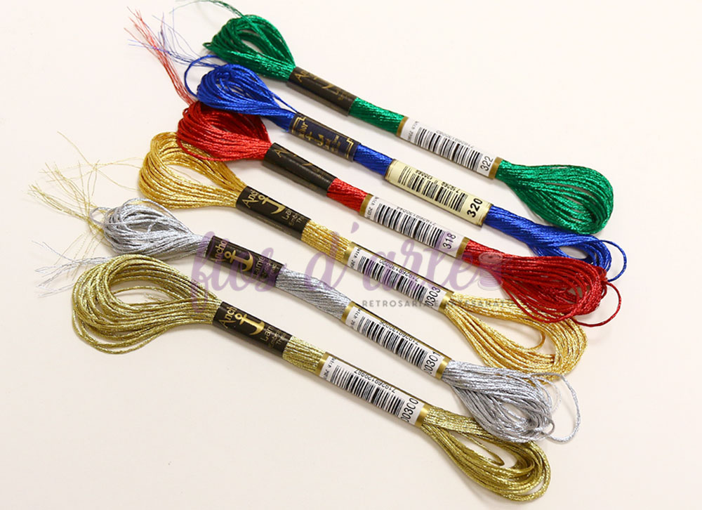 Linha para bordar Lamé Composição: 65% Viscose + 35% Polyester Metalizado Meadas de 8 metros