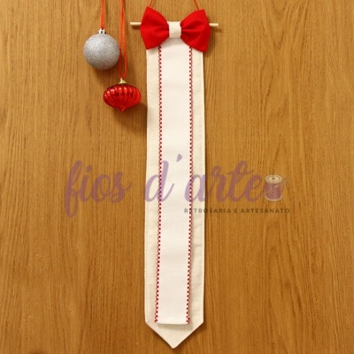 Painel Natalício com laçarote para bordar ponto cruz #1 Composição: 100% algodão Tamanho: +/- 10x55cms (+ o fio) Tamanho da barra de quadrilé: +/- 5x46cms Inclui o pauzinho de madeira e o fio para pendurar.
