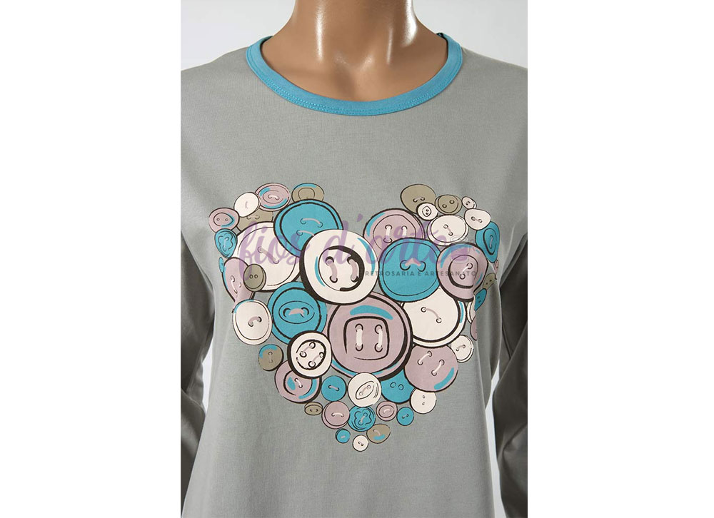 Características: - Pijama sem carda, com camisola de mangas compridas e estampado central. - Calças compridas lisas, ajustáveis na cintura com elástico, para senhora.