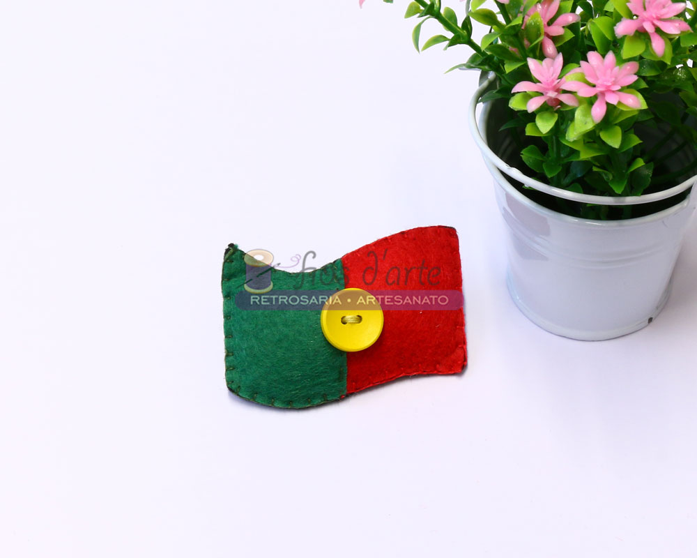 Pregadeira em feltro Bandeira de Portugal Composição: 100% poliester (feltro) Tamanho: 6x3,5cms Cor: cores da bandeira de Portugal