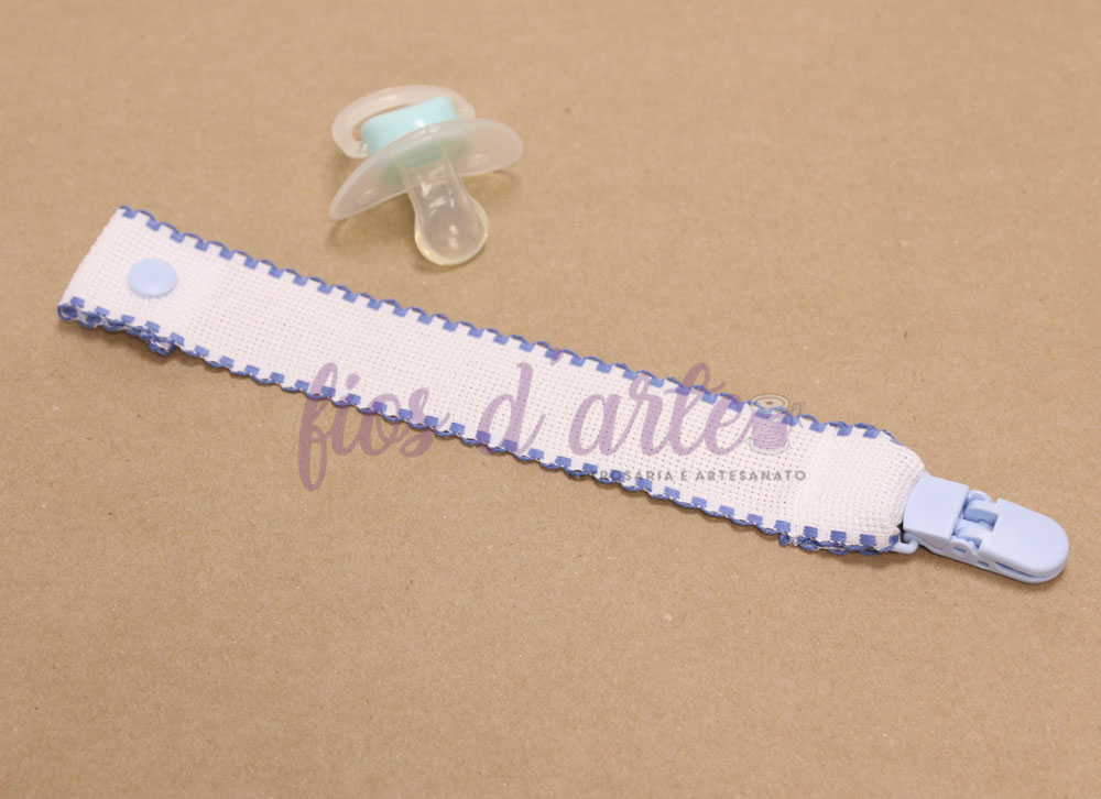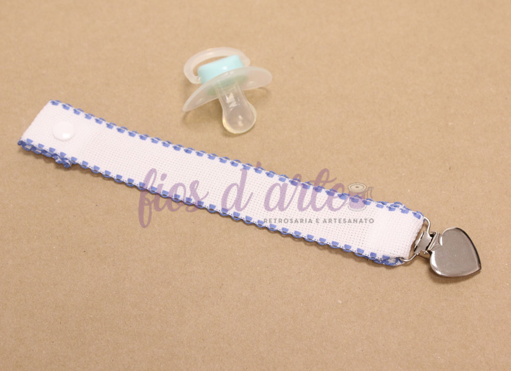 Prende-chupeta com fita em quadrilé para bordar ponto cruz #11 (Fios d'arte)