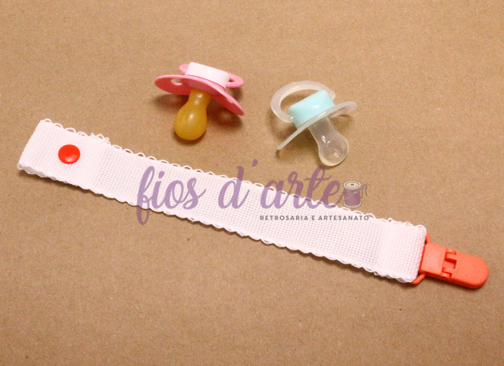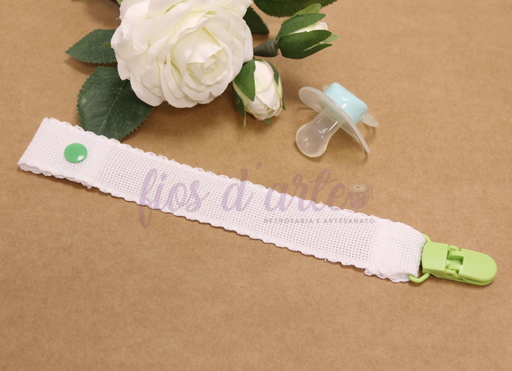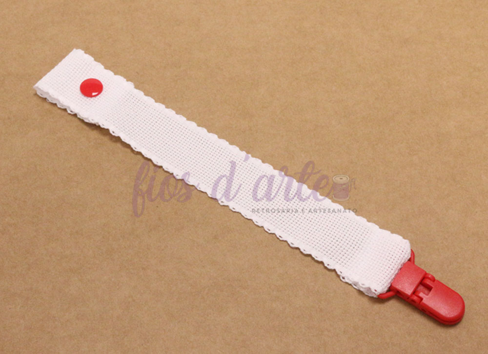 Prende-chupeta com fita em quadrilé para bordar ponto cruz #1 (Fios d'arte)