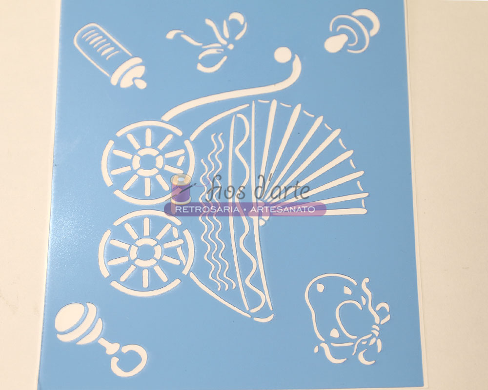 Stencil com motivos relacionados com bebé: carrinho de bebé, chupeta, biberão, laço, babete e roca.