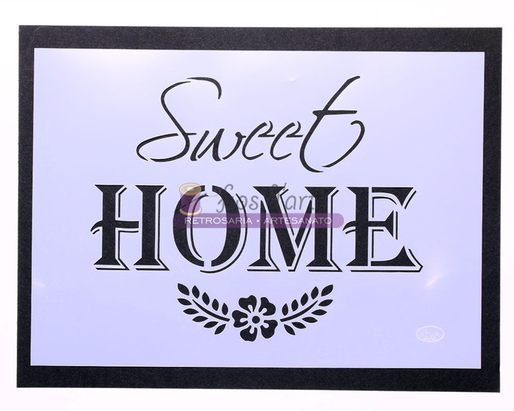 Stencil com as palavras Sweet Home e uma flor.