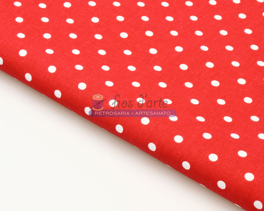 Tecido Bolas Largura: +/-140cms Composição: 100% algodão Cor: fundo vermelho com bolas brancas (bolas têm +/- 0,6cms de diâmetro)