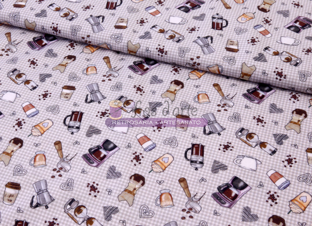 Tecido Café Composição: 100% algodão Largura: 150cms Tecido em xadrez pequeno em castanho clarinho com motivos relacionados com café.