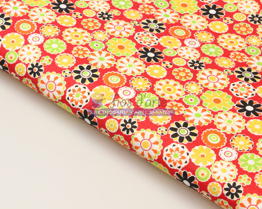 Tecido Flores II Composição: 50% poliester, 50% algodão Largura: 150cms Cor: Vermelho e amarelo