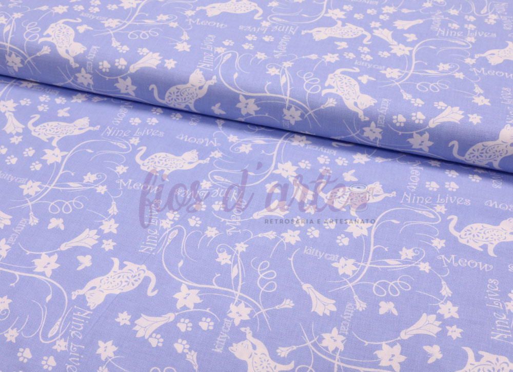 Tecido Kittens in the Garden - Gatinhos e flores azul