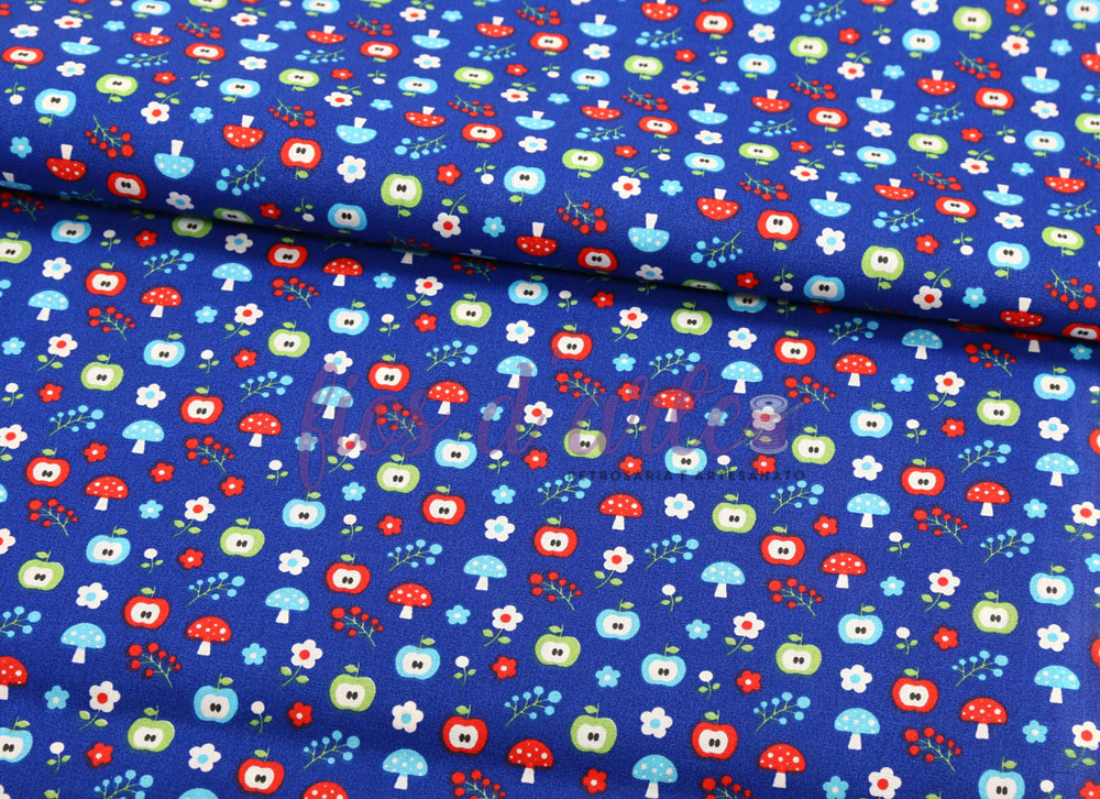 Tecido Maçãs com cogumelos (Fabricart) - Azul marinho