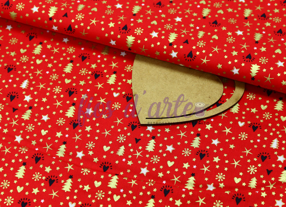 Tecido Motivos Natalícios - fundo vermelho com dourados