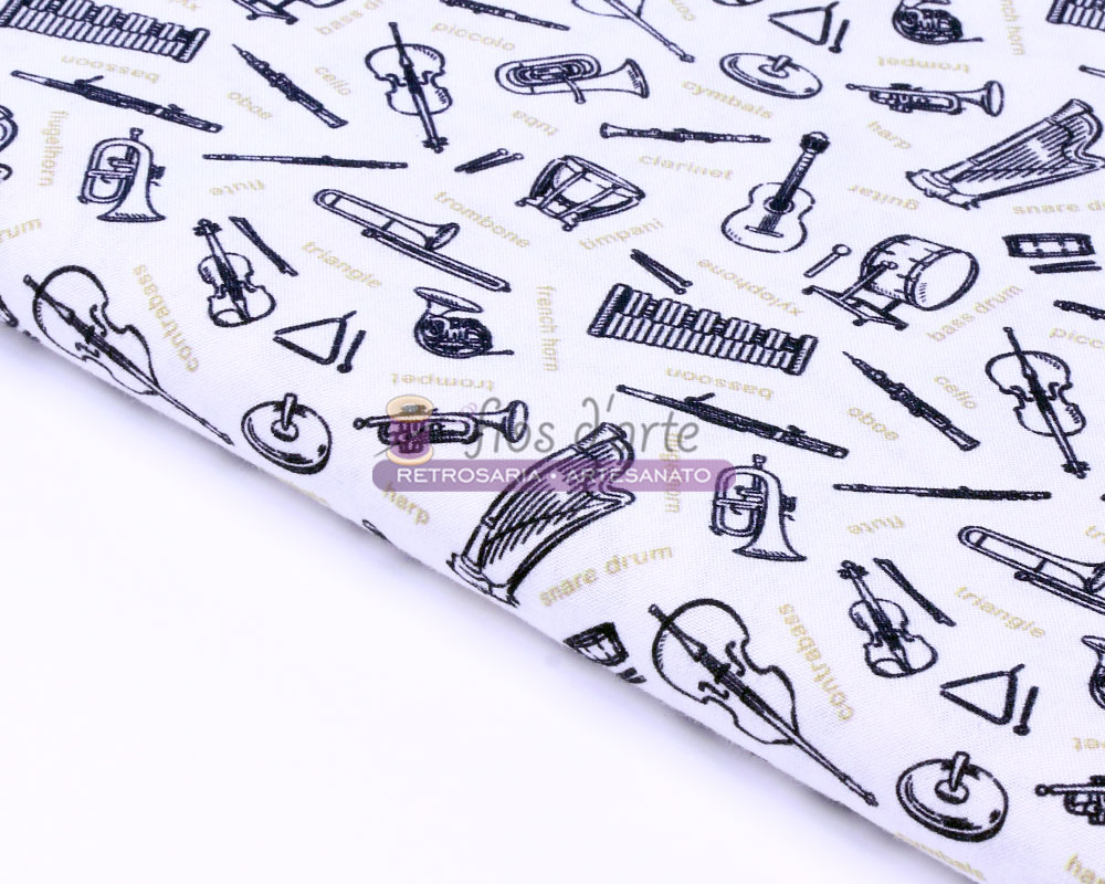 Tecido percal estampado com instrumentos musicais: trompetes, flautas, clarinete, harpas, violino... Tecido versátil e com inúmeros utilizações para patchwork, artesanato, moda, acessórios... Largura: 150cms Composição: 100% algodão