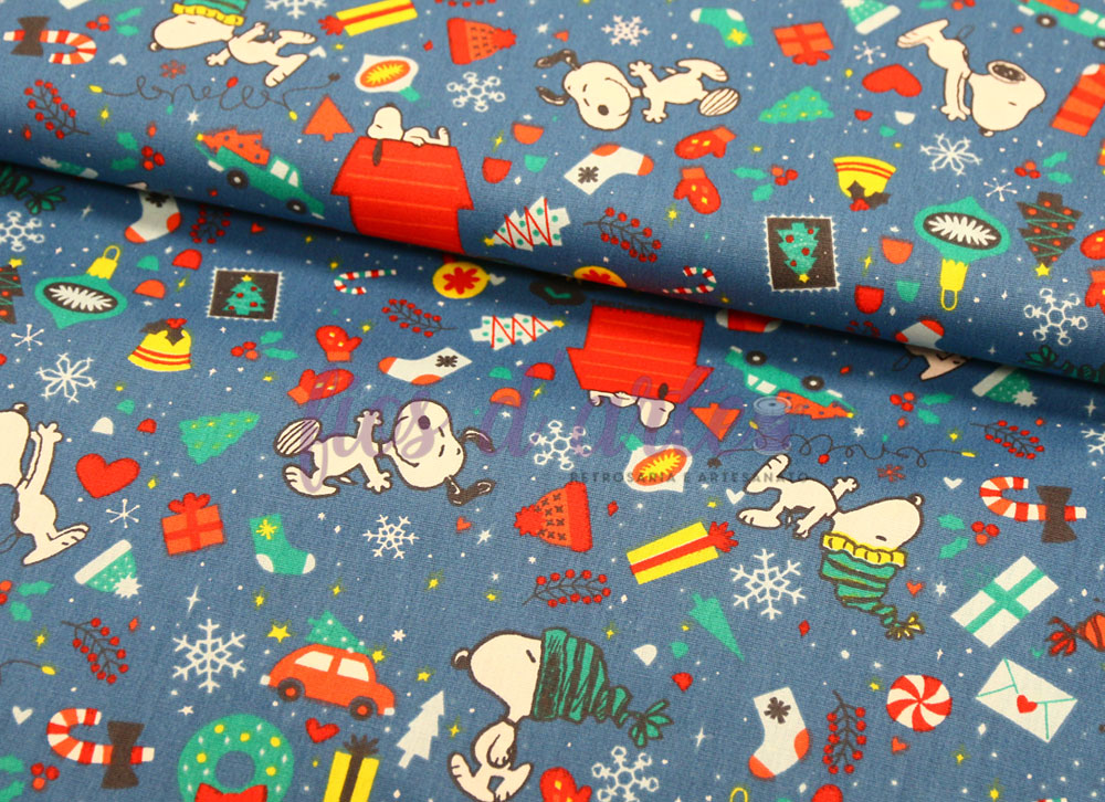 Tecido Snoopy Natalício II Composição: 100% algodão Largura: 150cms Gramagem: 115 gr/m2 Cor: fundo azul petróleo com motivos alusivos ao Snoopy no Natal