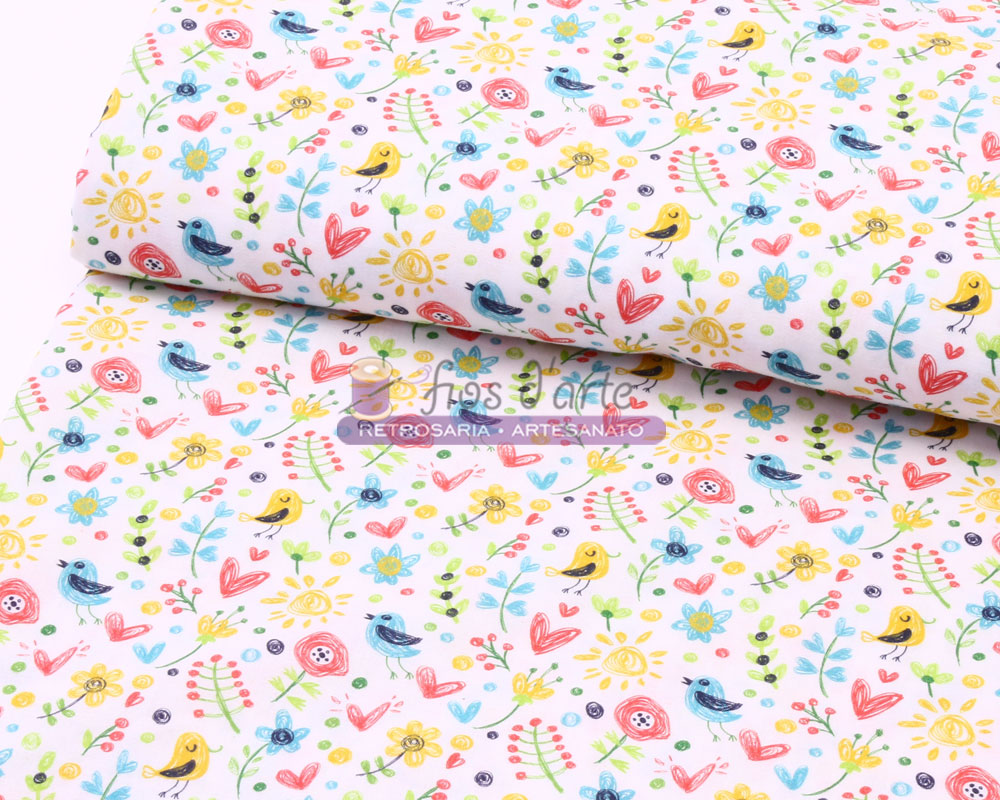 Tecido de estampagem digital em percal de algodão com passarinhos, flores, corações, e sóis em tons multicolor