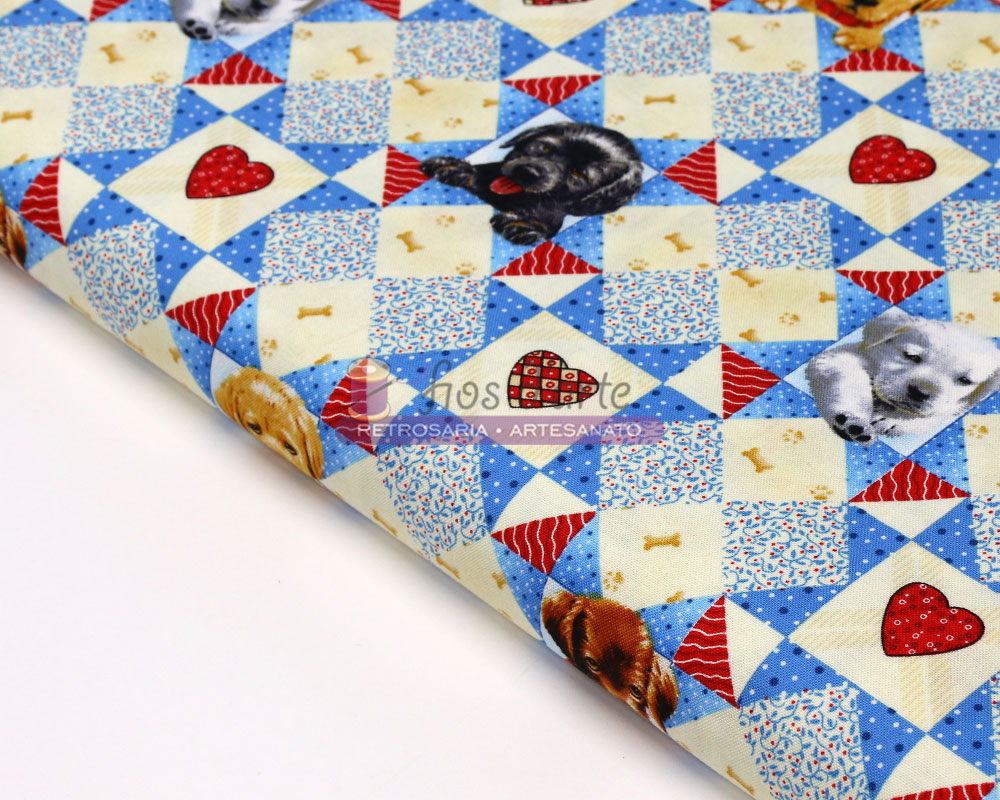 Tecido Pups in the Garden - corações e cãezinhos