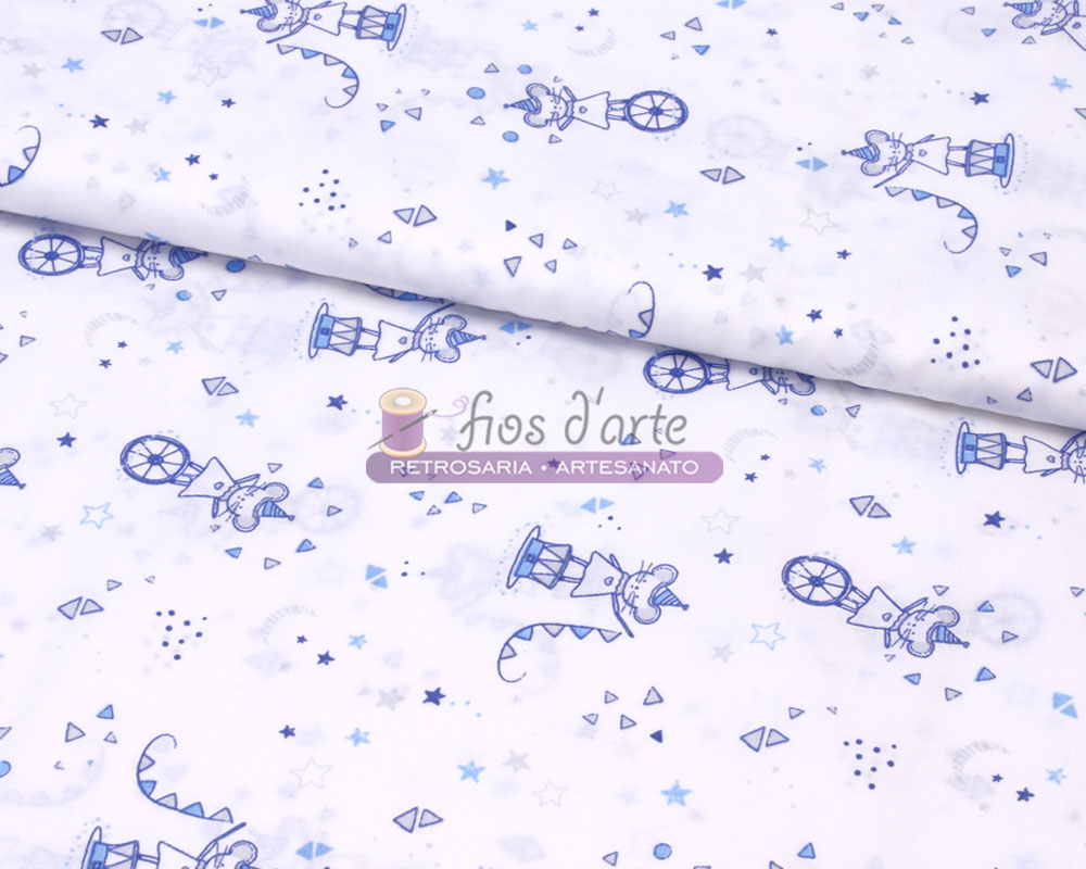 Tecido Ratinho no circo Largura: 160cms Composição: 50% algodão e 50% poliester Cor: azul