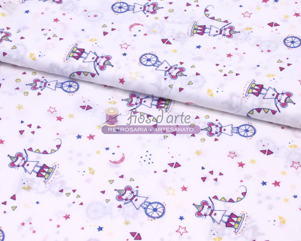 Tecido Ratinho no circo Largura: 160cms Composição: 50% algodão e 50% poliester Cor: rosa e amarelo