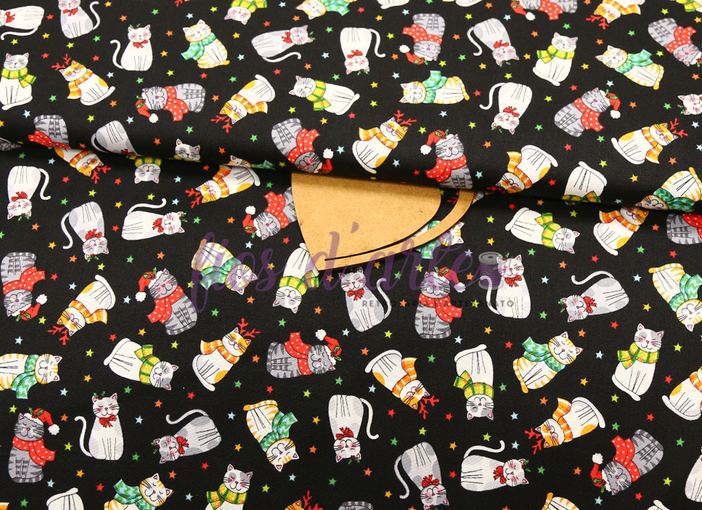 Tecido Santa Paws Gatos coloridos Composição: 100% algodão Largura: 110cms Cor: gatos coloridos e fundo preto