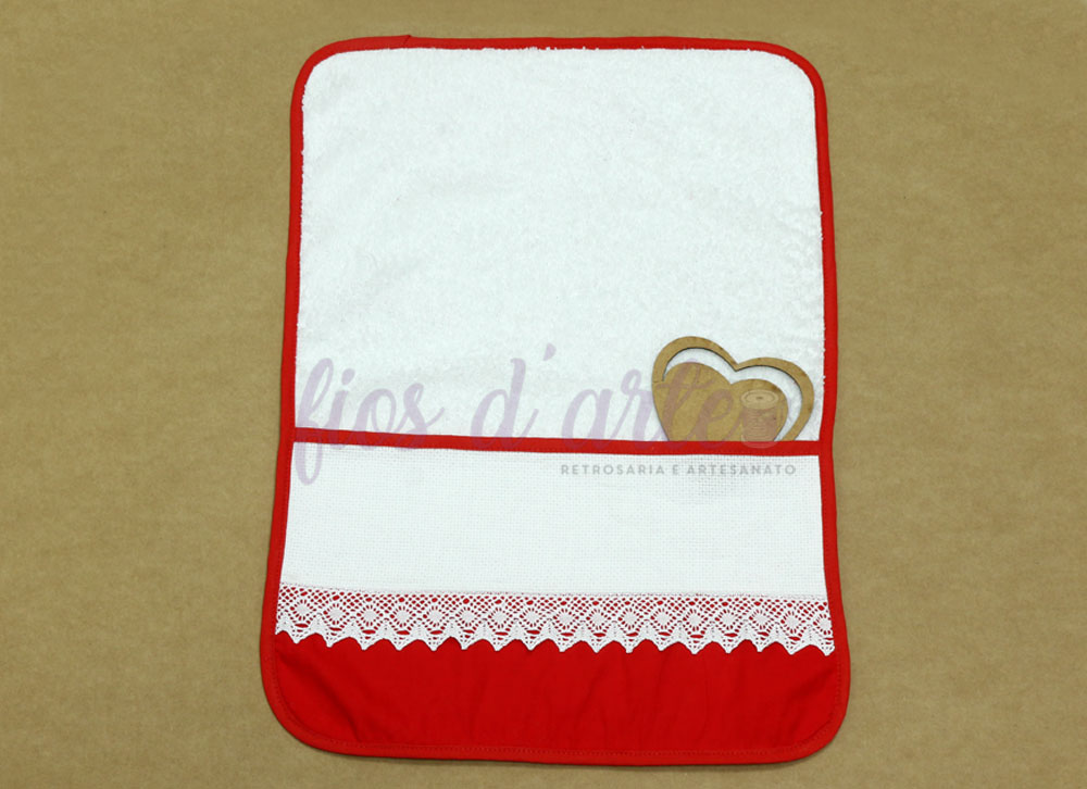 Toalha em turco, com aplicação de tecido, renda e quadrilé, com acabamento em viés.